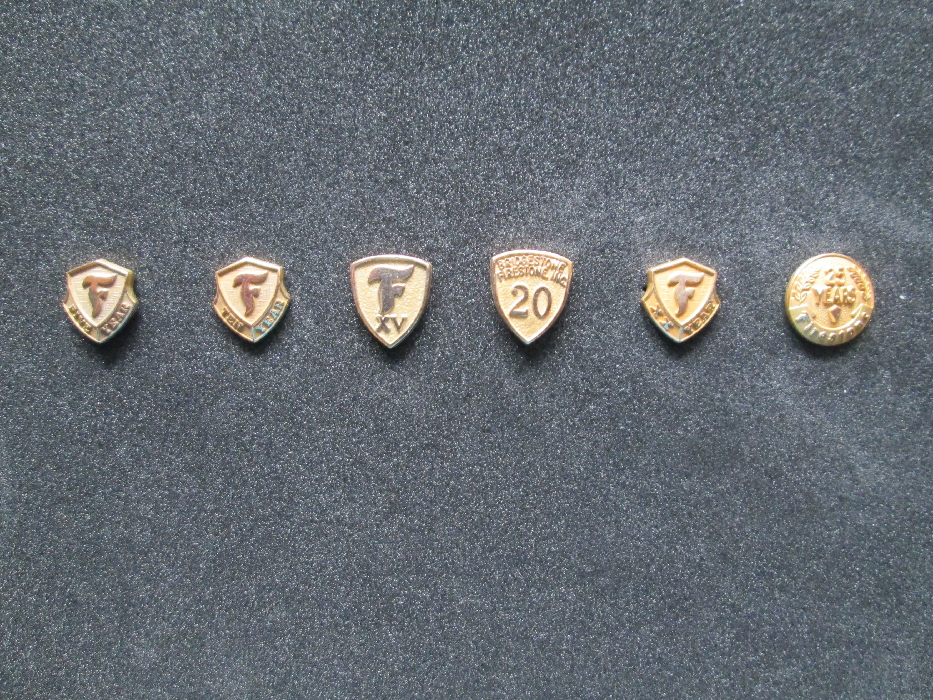 Firestone Employee years of service pins, 10K Gold filled. Firestone supplied the tires for Woodill Wildfires.