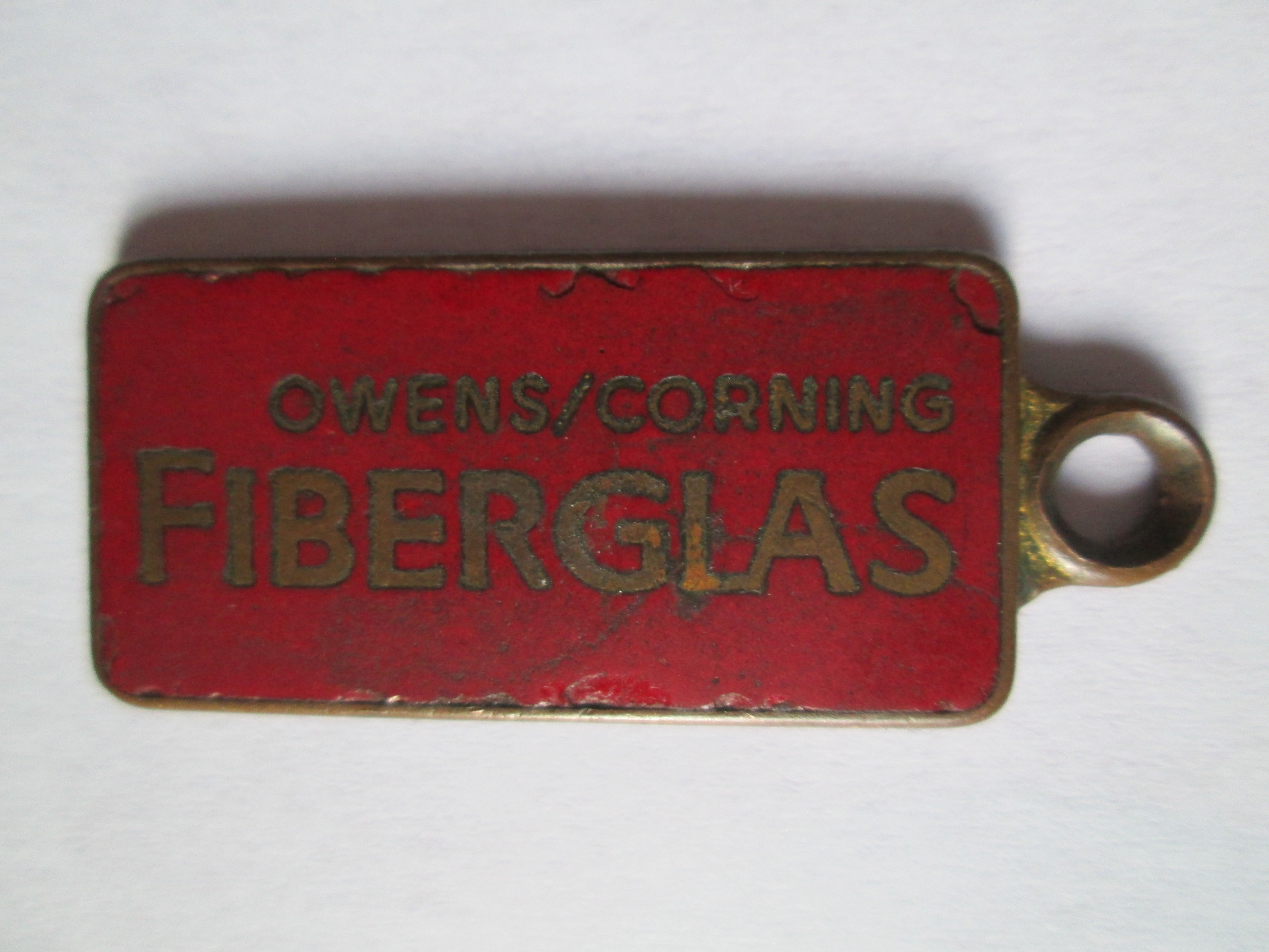 Owens/Corning Fiberglas, promotional keychain medallion. Owens/Corning with a slash not a hyphen.