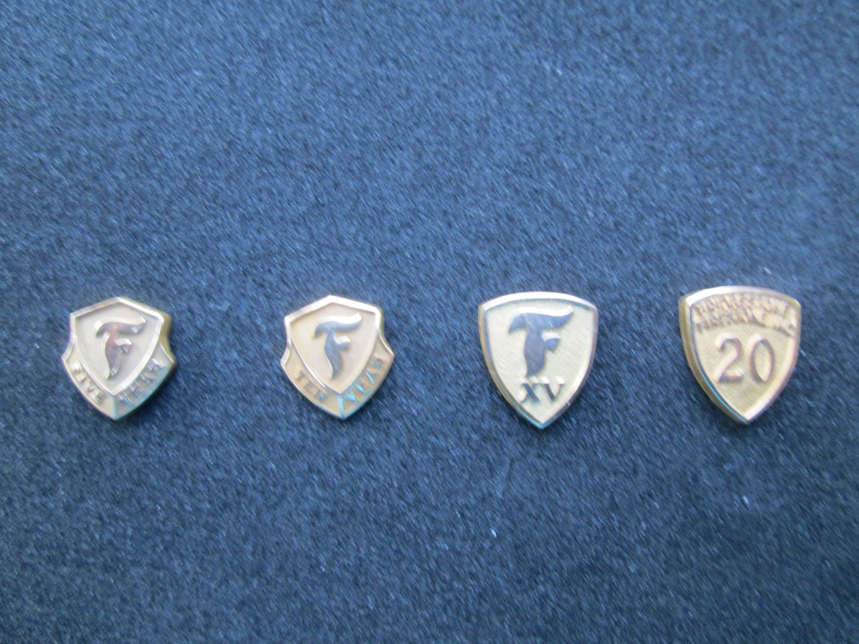 Firestone Employee years of service pins, 10K Gold filled. Firestone supplied the tires for Woodill Wildfires.