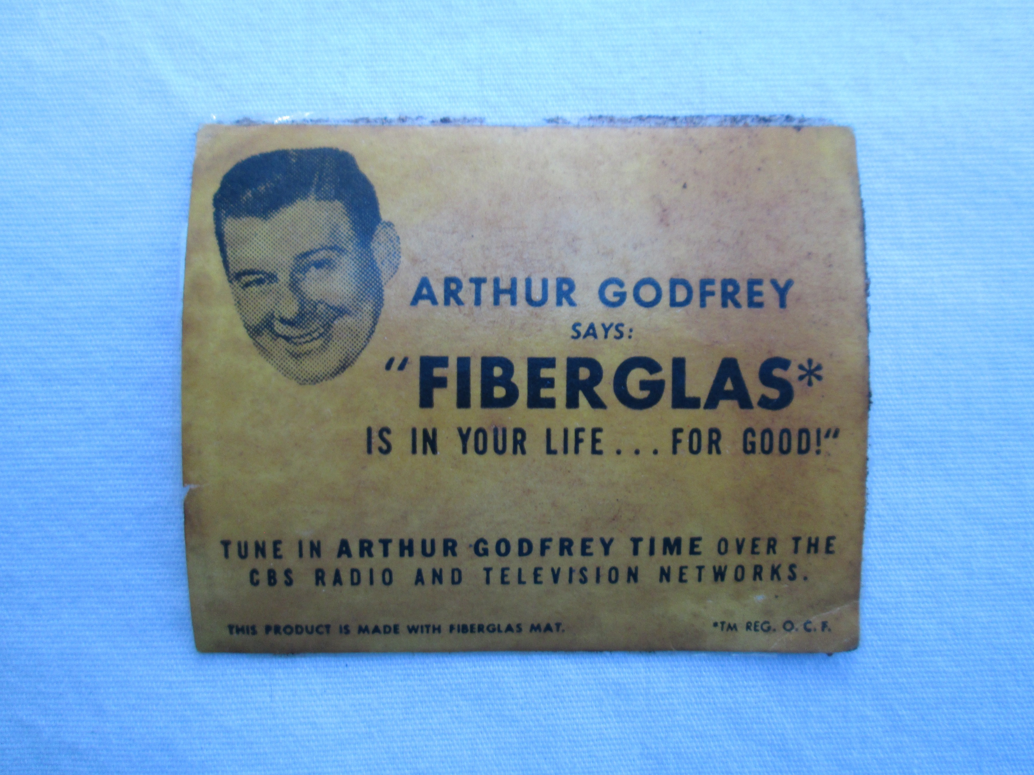 Owens-Corning Fiberglas promotional adhesive-backed sticker. Sticker made of Fiberglas mat. TV & Radio personality Arthur Godfrey tie-in with advertising.