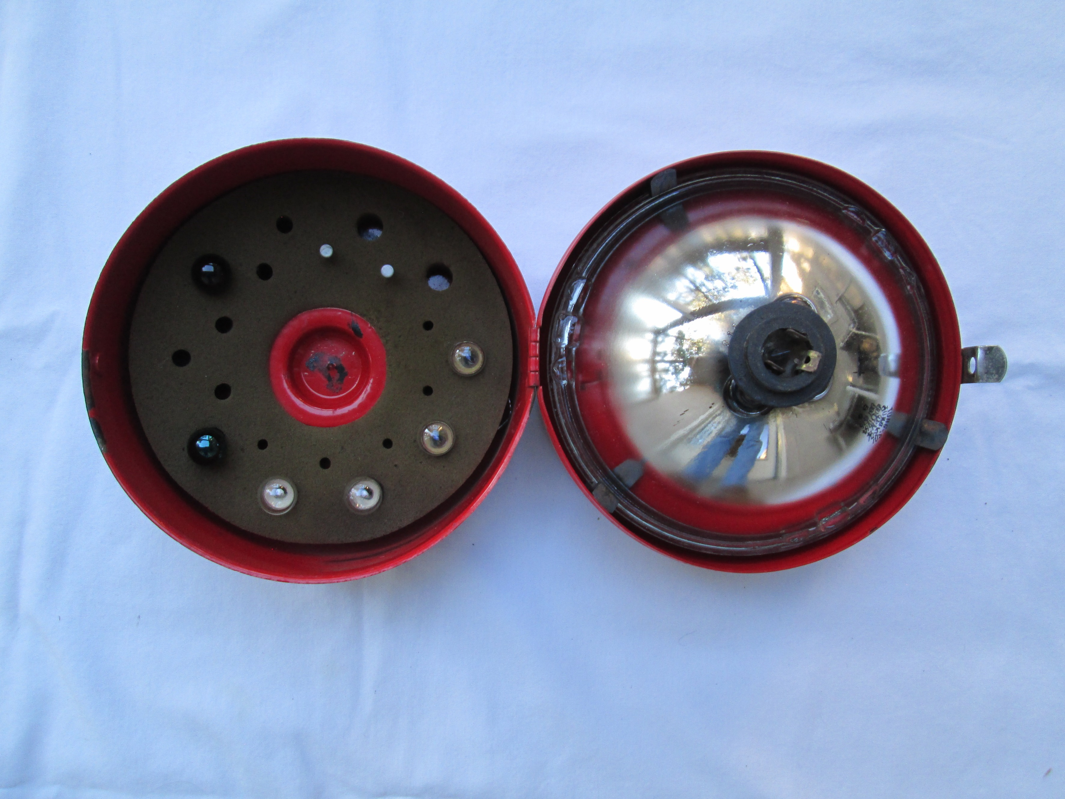 Top is hinged, here it is open. Showing headlight bulb on the right side, with smaller bulbs and fuses on the left side.