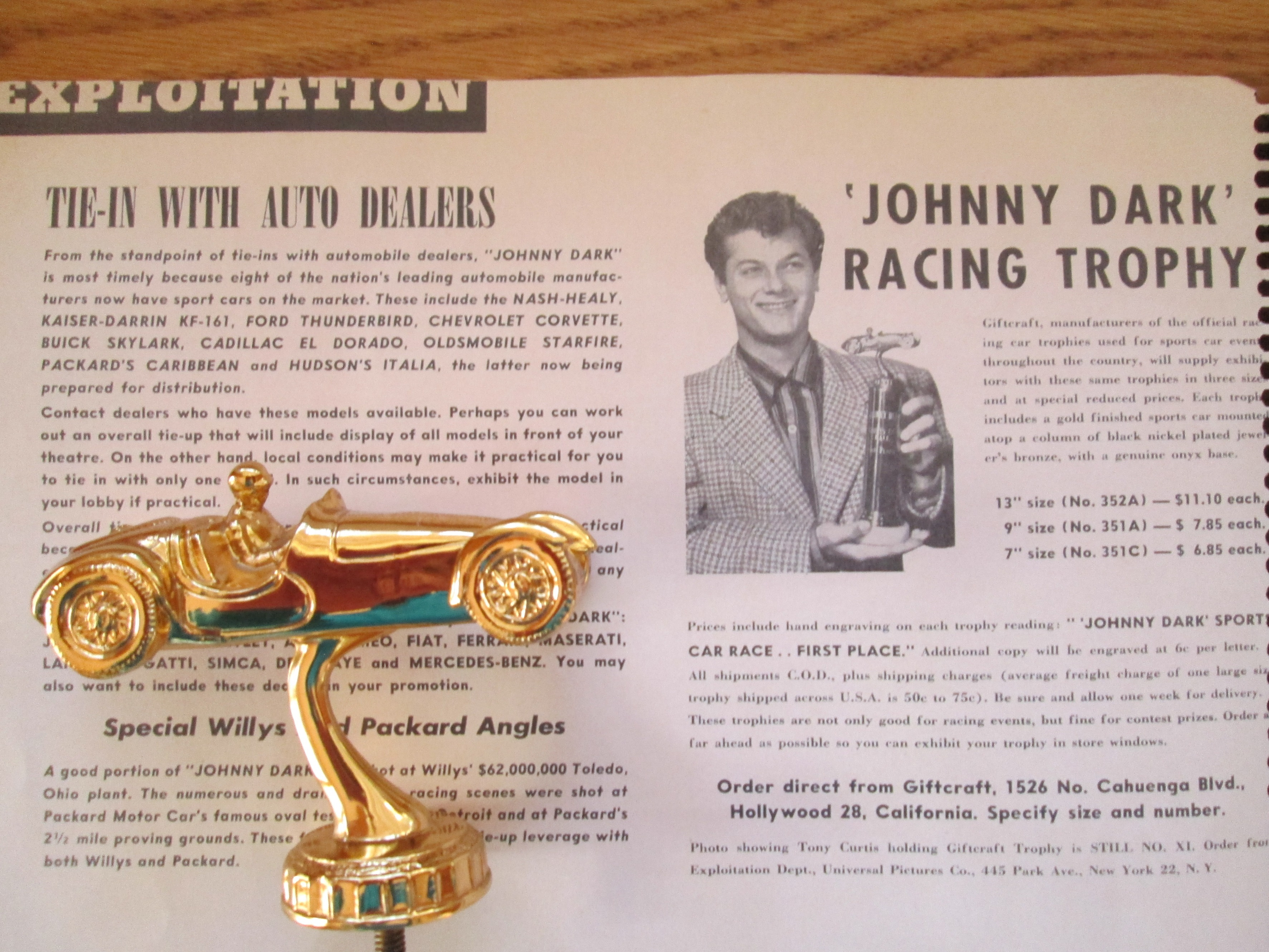 Johnny Dark movie promotional trophy shown, for sale to movie theaters and auto dealerships. The base for the trophy is missing.